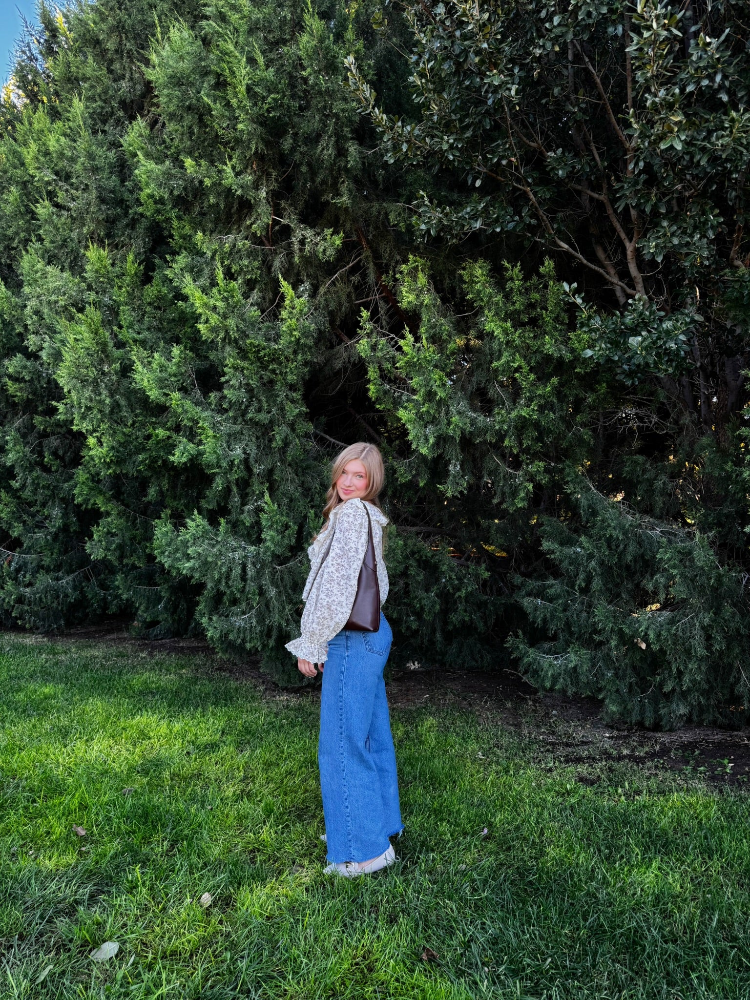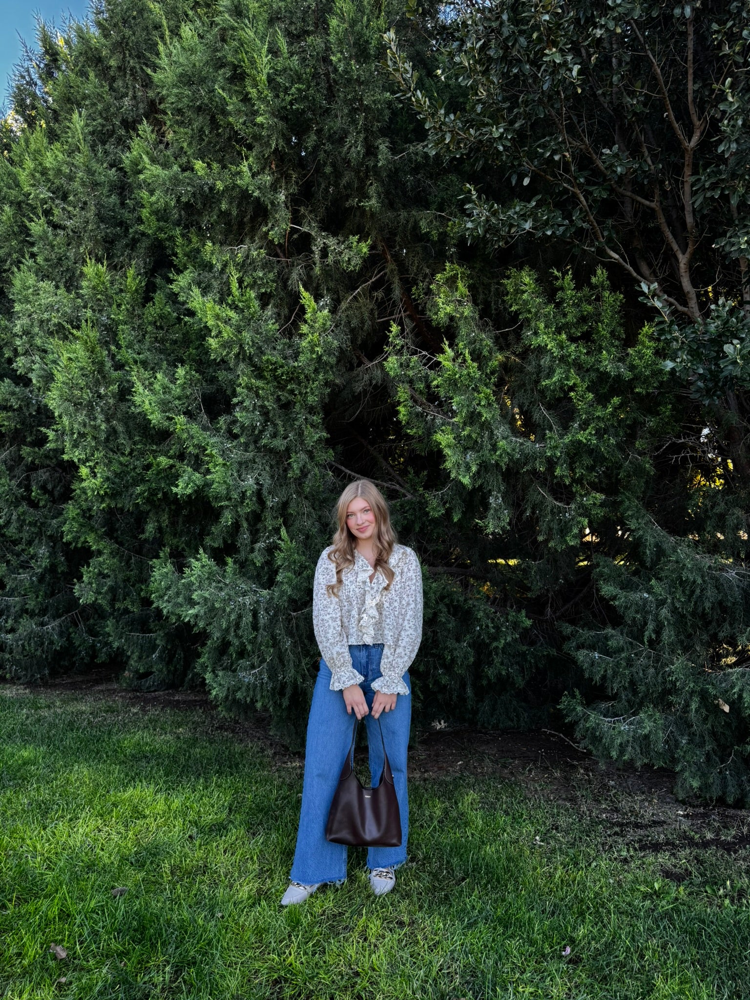 Embrace effortless elegance with this vintage-inspired piece featuring a textured floral print and graceful drape. The relaxed silhouette flatters with a V-neckline adorned by wide ruffled trim and delicate lace edging, while long puff sleeves showcase elasticized ruffle cuffs for added dimension. Vertical pintuck pleats across the front and back create sophisticated texture and movement, while a hidden partial front tie closure allows for customizable styling. Perfect for those seeking refined, timeless pieces with thoughtful construction details.
